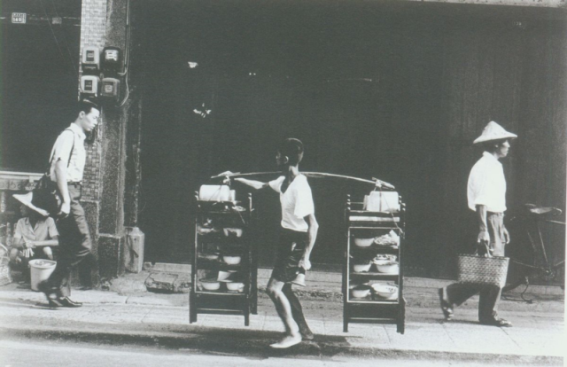 除了中央的飲食擔(dān)外,右側(cè)行人手提著草木編織的手提袋,左下角隱約可見竹編籃子。(姚孟嘉/淡水/1973)攝影作品現(xiàn)藏于臺北市立美術(shù)館,翻拍自《時(shí)代之眼:臺灣百年身影》(臺北:臺北市立美術(shù)館,2011)。