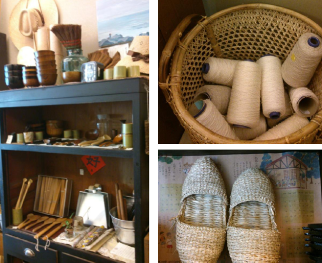 各式民具:左圖可見藺草帽、棕櫚鬃掃帚、各色竹制食器、亞鉛畚箕。右上黃藤編藍(lán)中裝著麻線、棉線。右下為藺草鞋。(筆者攝于「綠兔子工作室」)
