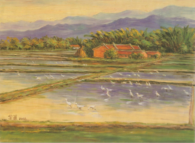 在我問東問西的過程中,母親拿出一張收藏的月歷紙說:「以前我們老家就長得像這樣,前面是田圃,后面是竹林、樹叢。和這畫太像了,所以一直留著」。那是2009年的月歷,黎蘭的油彩畫作。(影像掃瞄自月歷)臺灣又有多少像這樣消失的美麗農(nóng)村呢,而相似的故事仍在上演。