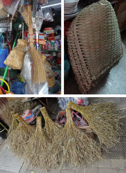 散見于老街五金行中的傳統(tǒng)民具:竹編魚簍、芒草掃帚、竹編火籠(左上)、竹編畚箕(右上)、竹制掃帚(下圖)